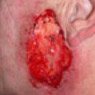 Probléma a gyógyítással – különösen az alsó lábszár. A radioterápiás terület átmérőjével, a sugárzás dózisaival és energiájával járó gyenge gyógyulás, a beteg kora> 90