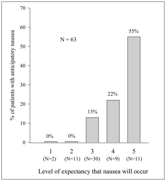 A klasszikus kondicionáló paradigma nem teljesen magyarázza meg az ANV kialakulását, a 22, 23-at és a kognitív tényezők, például a szorongás és a válaszadási várakozások szerepe az ANV fejlődésében. 7, 24-26 A szorongásról ismert, hogy befolyásolja az NV fejlődését legalább részben a negatív várakozásokon keresztül, 24, 27-29, és kölcsönösen negatív várakozások játszanak szerepet a szorongás kialakulásában. 16, 30 A kilátások befolyásolják a kondicionáló hatások kialakulását, 31-33 és fordítva, a kondicionáló hatás befolyásolja a várakozásokra adott válaszokat. 16, 34, 35 Ezért a szorongás és a válaszadási várakozások közvetíthetik a páciensek kondicionálását az ANV felé. Számos tanulmány kimutatta, hogy a válaszadási várakozások jelentősen megjósolják az ANV 23, 26, 36-38 előfordulását A kutatócsoportunk által lefolytatott, 63 különböző típusú rákos női rákos betegek által leíró leíró vizsgálat azt mutatta, hogy a várható élettartam erőteljesen megjósolta az émelygés kialakulását a harmadik kemoterápia (p = 0,001). Az émelygés várakozását az első kezelést megelőzően egy ötpontos szemantikus besorolási skála alapján értékelték, melynek egyik végén “1” = “Biztos vagyok benne, hogy nem lesz hányinger”, a másik pedig “5” = ” Biztos vagyok benne, hogy hányingerkorzom. “36 (Lásd a 2. ábrát)