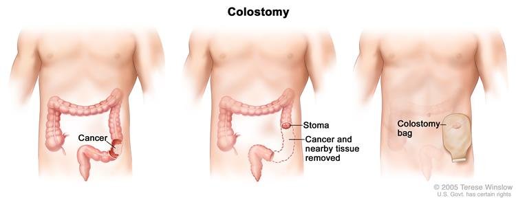 Colon rákos műtét kolosztómiával. A rákot és a közeli egészséges szövetet tartalmazó vastagbélréteg egy részét eltávolítjuk, sztómát hozunk létre, és egy kolosztóniás tasakot kötünk a sztómához.